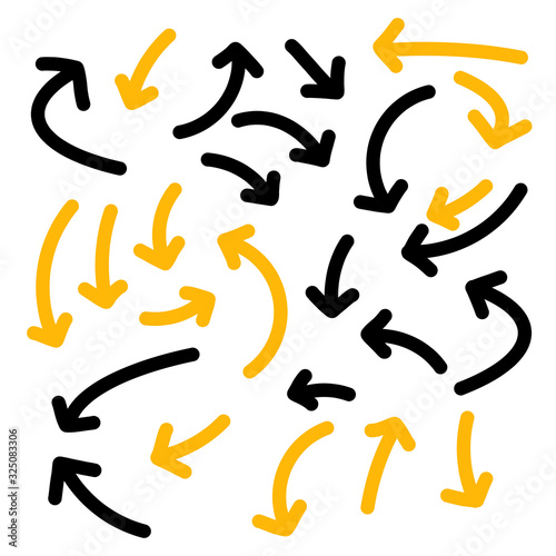 abstract, arrow, pointer, set, pack, collection, web, left, right, up, down, direction, directional, moving, way, element, symbol, forward, backward, shape, template, business, infographic, doodle, hand, drawn, vignetting, stroke, loop, curve, swirl, line, bold, thick, yellow, black