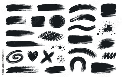 Hand drawn brush strokes set featuring various grunge textures and ink splatters for creative design
