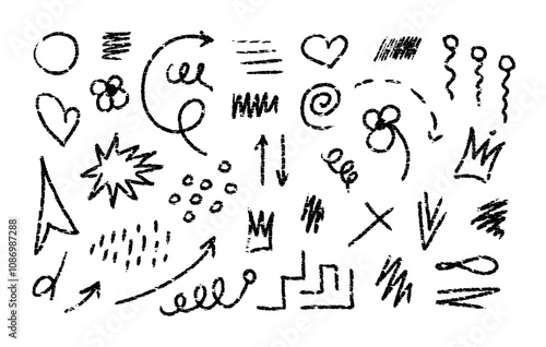 Hand drawn chalk lines, zigzags, waves, arrows, hearts, flower, dots. Vector charcoal smears. Underline pen set. Doodle crayon style sketch lines. Horizontal wavy strokes with rough edges.