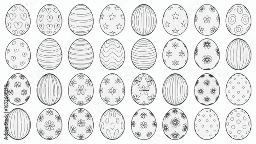 easter egg, line art, hand-drawn, black-and-white, heart, stripes, star, flower, swirl, pois, decorative, festive, spring, illustration, simple, graphic, pattern, celebration, holiday, traditional