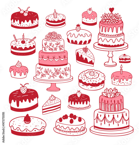 Hand Drawn Doodle Cake Vector Collection – Cute and Pretty Wedding Cakes, Birthday Cakes, Celebration Desserts, Whimsical Sweet Treats for Party, Sticker, and Bakery Design