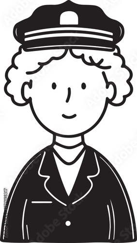 Hand Drawn Elderly Female Police Officer Black and White Illustration in Minimal Line Art Style Design