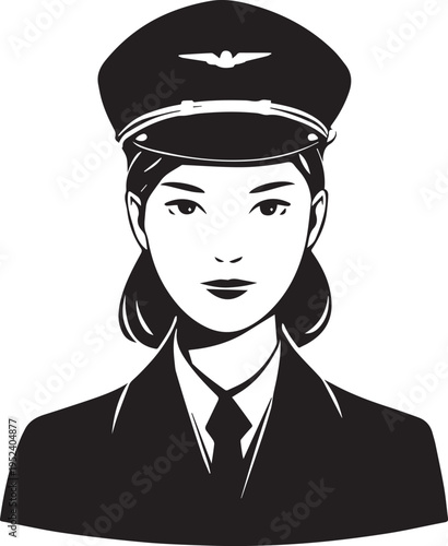 pilot, airman, captain, flight, aviation, aircraft, aeroplane, cockpit, uniform, airline, transport, travel, sky, flying, navigation, professional, occupation, job, woman, female, avatar, portrait, head shot, character, illustration, hand-drawn, outline, vignetting, contour, monochrome, black, white, minimal, minimalism, simple, clean, modern, flat, vector, graphic, cartoon, silhouette, icon, profile, isolated, background, digital, editable