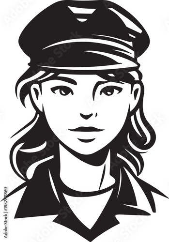 pilot, airman, captain, flight, aviation, aircraft, aeroplane, cockpit, uniform, airline, transport, travel, sky, flying, navigation, professional, occupation, job, woman, female, avatar, portrait, head shot, character, illustration, hand-drawn, outline, vignetting, contour, monochrome, black, white, minimal, minimalism, simple, clean, modern, flat, vector, graphic, cartoon, silhouette, icon, profile, isolated, background, digital, editable