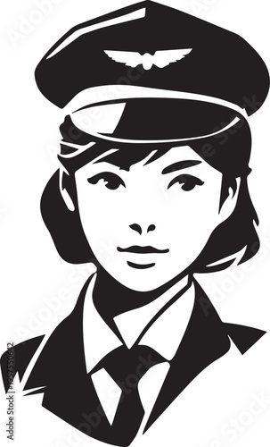 pilot, airman, captain, flight, aviation, aircraft, aeroplane, cockpit, uniform, airline, transport, travel, sky, flying, navigation, professional, occupation, job, woman, female, avatar, portrait, head shot, character, illustration, hand-drawn, silhouette, shape, bold, monochrome, black, white, minimal, minimalism, simple, clean, modern, flat, vector, graphic, icon, profile, isolated, background, digital, editable, clip art, front view