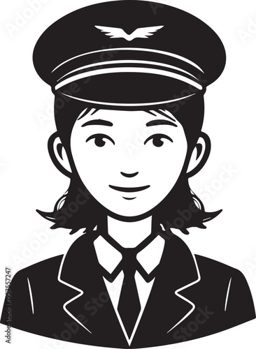pilot, airman, captain, flight, aviation, aircraft, aeroplane, cockpit, uniform, airline, transport, travel, sky, flying, navigation, professional, occupation, job, woman, female, avatar, portrait, head shot, character, illustration, hand-drawn, silhouette, shape, bold, monochrome, black, white, minimal, minimalism, simple, clean, modern, flat, vector, graphic, icon, profile, isolated, background, digital, editable, clip art, front view