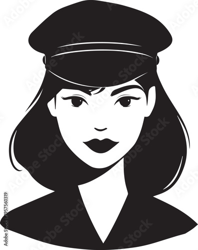 pilot, airman, captain, flight, aviation, aircraft, aeroplane, cockpit, uniform, airline, transport, travel, sky, flying, navigation, professional, occupation, job, woman, female, avatar, portrait, head shot, character, illustration, hand-drawn, silhouette, shape, bold, monochrome, black, white, minimal, minimalism, simple, clean, modern, flat, vector, graphic, icon, profile, isolated, background, digital, editable, clip art, front view