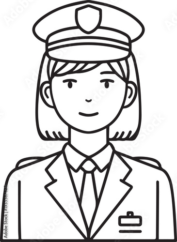police, officer, woman, female, uniform, law enforcement, security, authority, confident, modern, stylish, hat, badge, protection, safety, service, professional, illustration, line art, black-and-white, minimalistic, vector, graphic, icon, symbol, logotype, editorial, commercial, digital
