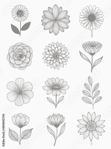 flower, floral, botanical, illustration, drawing, vignetting, outline, nature, decorative, design, element, vintage, leaf, bloom, garden, daisy, rose, sunflower, marigold