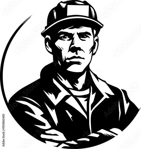 miner, mining, men at work, labourer, industry, excavation, coal, mineral, underground, helmet, hard hat, safety, uniform, equipment, labor, occupation, job, profession, male, man, avatar, portrait, head shot, character, illustration, hand-drawn, outline, vignetting, contour, monochrome, black, white, minimal, minimalism, simple, clean, modern, flat, vector, graphic, silhouette, icon, profile, isolated, background, digital, editable
