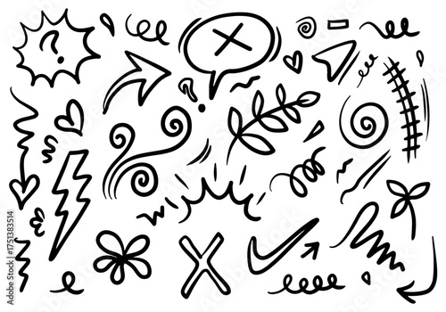 Hand drawn marker simple elements set. Doodle pen signs and effects. Simple thunderbolt, star, glitter, icons, heart, floral objects. Decorative pencil curved symbols and shape.