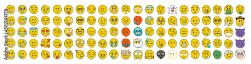 Hand drawn yellow emoji in flat shape style. Funny emoticons faces with facial expressions. Big set.