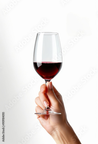 hand elegantly holding a glass of red wine against a white background. The rich color of the wine and the clear glass highlight themes of sophistication, celebration, and fine dining.