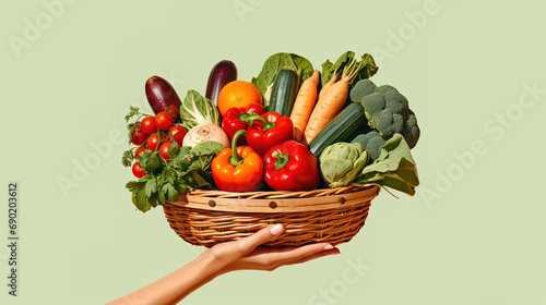 Hand holding a basket full of vegetables. Healthy nutrition concept