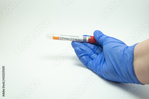 Hand holding a blood test. The blood test is from Coronavirus, 2019-NcOv. Tests positive for coronavirus. The glove is blue and the background is white.