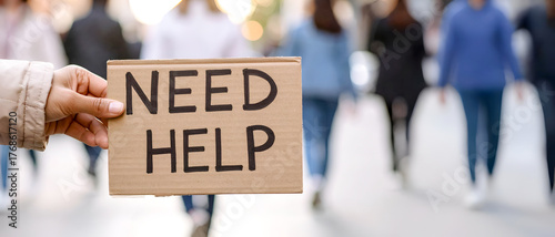 Hand Holding a Cardboard Sign with "NEED HELP" Text in a Crowded Urban Street, Symbolizing Crisis.