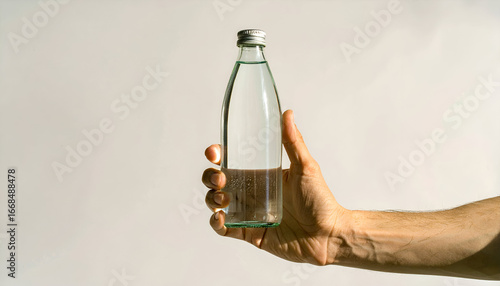 water, bottle, glass bottle, clearwater, drinking water, hand, holding, white background, healthy, hydratation, refreshment, pure water, clean water, lifestyle, health, wellness, beverage, drink, studio shot, template, design element, advertising, commercial, marketing, branding, cardboard box, water bottle, mineral water, spring water, thirst, quench, healthy lifestyle, well-being