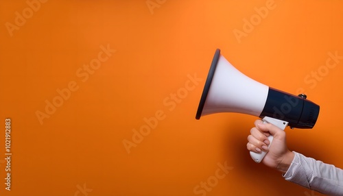 Hand holding A megaphone announces sales and discounts, on a vibrant orange background. Marketing banner