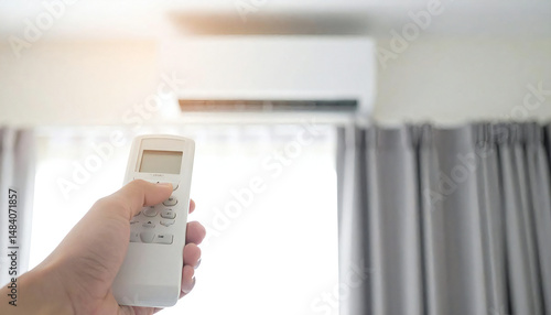 エアコンのリモコンを持つ手。快適な部屋の背景イメージ。Hand holding air conditioner remote control. Comfortable room background image.