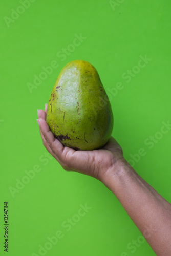 hand holding an aguacate on green background - popart greenery design