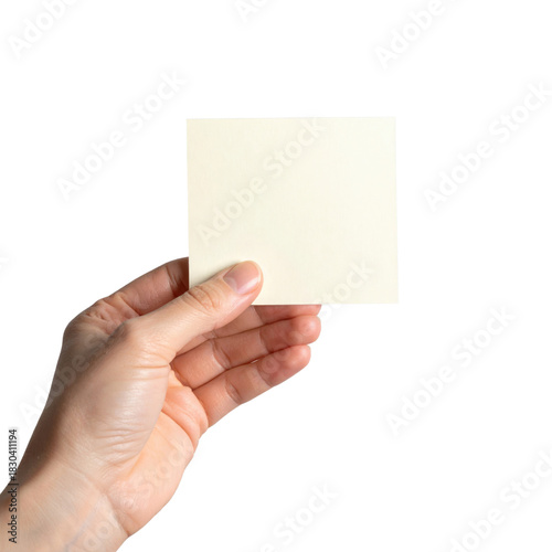 Hand Holding Blank Cream Colored Square Sticky Note Paper isolated on transparent background. PNG die-cut for advertising
