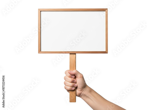 hand, signs, blank, wooden, frame, rectangular, vertical, white, background, hold, empty, message, display, notice, board, wood, stick, paper, plain, simple