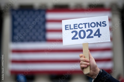 Hand Holding Elections 2024 Sign Against American Flag