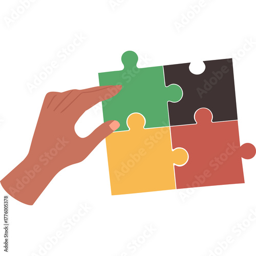 Hand Holding Green Puzzle Piece Connecting Four Colorful Puzzle Pieces Together Representing Unity Diversity and Teamwork