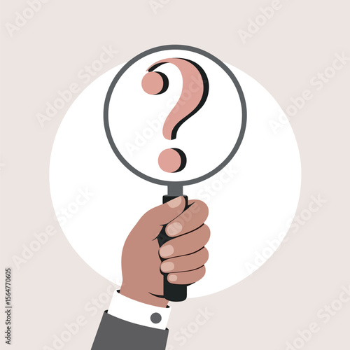 hand, magnifying, glasses, question, mark, pink, grey, white, background, circle, business, researching, search, solution, problem, concept, illustration, vector, graphic, design, mystery, doubt, uncertainty, investigation, research, answer, help, support, faq, information, cognition, curious, puzzle, clue, seek, find, solve