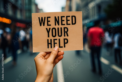 Hand Holding Sign Saying “We Need Your Help” in Urban Crowd Scene Symbolizing Call for Support, Awareness or Community Engagement