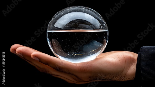 water, globe, hand, sphere, clear, crystal, liquid, purity, holding, surface, reflective, transparent, clean, detail, concept, palm, black, background, bubble, droplet, ball-shaped, glimmering, pristine, simplicity, sharpened, stillness, glossy, flawless, serene, peacefulness, calmness, balance, support, gleaming, polished, clarity, aqueous, immaculate