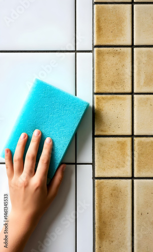 Hand holds a dry sponge and wipes dirty tiles, demonstrating the contrast between clean and dirty surfaces. Concept of cleanliness, cleaning and efficiency of household chemicals.