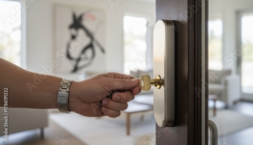 Hand inserting key into door lock inside bright modern home symbolizing real estate ownership and secure housing concept
