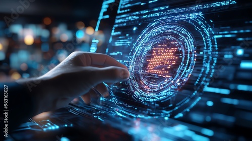Hand interacting with futuristic digital interface. Touchscreen displays data and holographic elements in a high-tech environment.