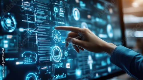 hand, screen, interface, futuristic, technology, digital, datum, code, display, monitor, blue, glowing, line, graphic, abstract, interaction, touch, gesture, system, network, information, control, innovation, progress, future, modern, concept, design, background, software, hardware, application, program, development, science, tech, cyber, virtual, reality, automation, artificial, intelligence, web, cloud, computing, analysis