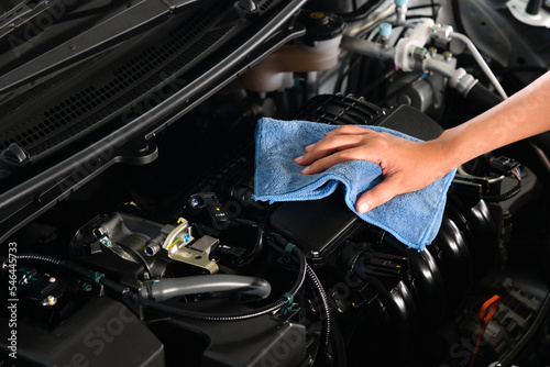 hand of a man holding a blue cloth caring, maintenance car and cleaning And engine car room.Hand focus selection