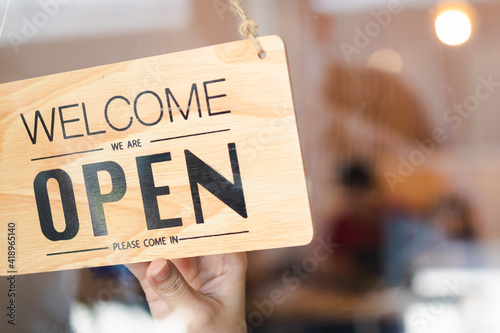 Hand of woman owner retail,coffee shop woman turning sign board to open with wearing face mask ,protection to pandemic of coronavirus reopen store,restaurant after close lockdown quarantine in covid.