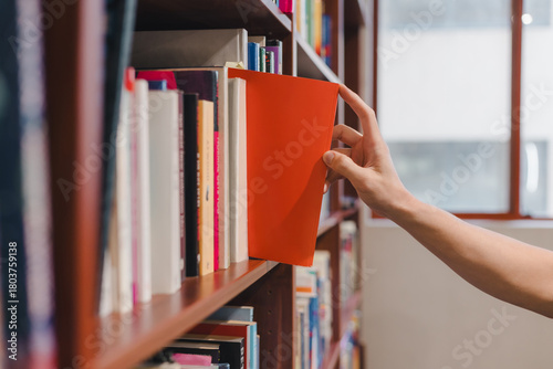 Hand picking a red book from library bookshelf in soft natural light. Ideal for concepts of education, knowledge, research, learning academic environments.