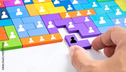 hand, puzzle, piece, placement, team, diversity, inclusion, recruitment, fit, role, position, organisation, management, strategy, hiring, people, icon, symbol, connection, integration, match, choice, selection, decision, purple, blue, green, orange, grid, structure, oneness, collaboration, manpower, talent, hr, candidate, uniqueness, standout, visual, concept, metaphor, alignment, synergy