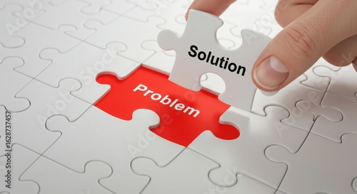 Hand placing the final puzzle piece labeled solution to solve the problem
