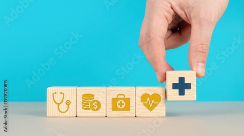 symbol, protection, table, health, wellness, investment, icon, suitcase, well-being, cube, money, management, medicals, building, arrangement, care, cost, plan, strategy, hospital, briefcase, wooden, blue, risk, cardiogram, prevention, finance, stethoscope, heartbeat, hand, therapy, saving, cross, doctor, policy, diagnosis, wooden blocks, lifestyle, treatment, insurance, coverage, background, placing, be of use