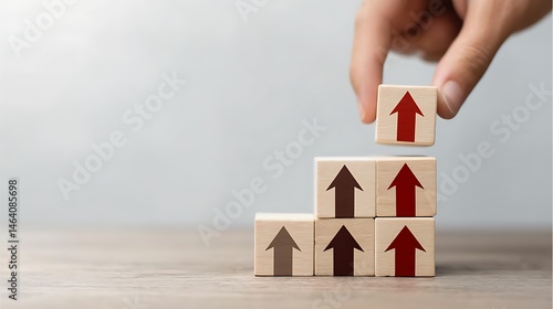 growth, progress, success, business, development, strategy, planning, achievement, goal, upward, arrow, block, wooden, cube, stack, hand, placing, building, increase, improvement, expansion, potential, ambition, future, target, objective, rising, climb, ladder, step, career, leadership, teamwork, concept, marketing