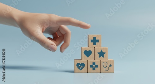 health, care, medicals, hand, block, wellness, health care, medicine, concept, therapy, treatment, symbol, nubes, cross, stethoscope, star, well-being, doctor, patient, support, assistance, touch, reaching, finger, pointing, wooden, stack, arrangement, blue, background, illustration, abstract, structure, representation, visual, design, composition, top, surface, isolated, cube, shape, balance, idea, organisation, building, pyramid, gesticulate, signs