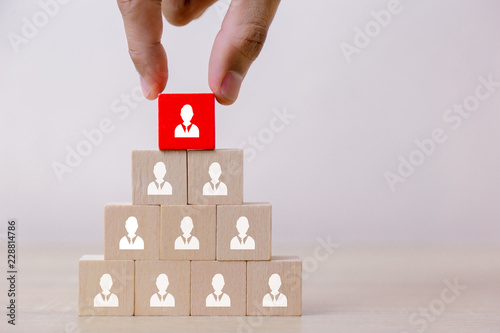 Hand putting wood cube block on top pyramid,human resource management and recruitment business concept, Business Strategy to success.