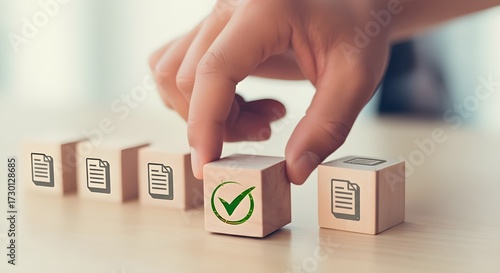Hand selecting wooden block with green checkmark symbol from row of document icons