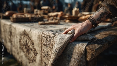 hand, clothes, table, wooden, rustic, linen, food, bread, market, mediaeval, arm, tattoo, scene, preparing, setting, detail, closeup, natural, light, gathering, ancient, culture, historical, fantasy, village, people, background, textile, design, pattern, brown, beige, folk, art, craft, texture, patterned, smooth, care, careful, sharpened, ambience, artisan, community