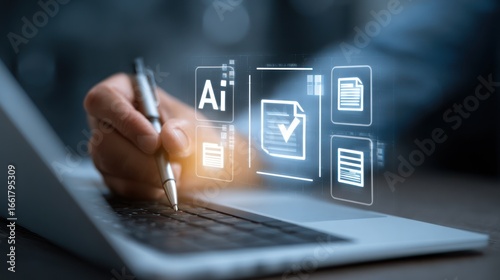 hand, pen, laptop, digital, document, icon, interface, overlay, technology, business, task, workflow, automation, process, efficiency, innovation, software, compliance, verification, approval, signing, electronic, modern, desk, work, office, computer, information, management, solution, system, application, connectivity, datum, future, screen, network, communication, connection, access, online, cyberspace, computing, strategy, analysis, progress, report, success, creativity