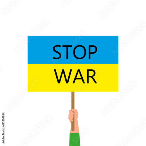 Hand with a poster stop the war on the flag of ukraine. Picket. Hand with a poster on a white background.