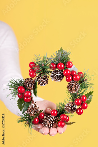 Hand with christmas wreath decoration. Isolated on yellow background.