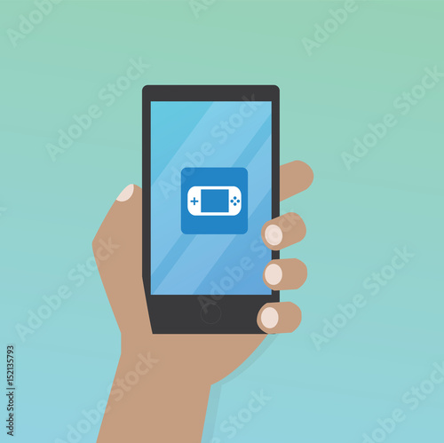 Hand with game icon on mobile phone vector illustration, Hand hold smart phone screen with gaming application